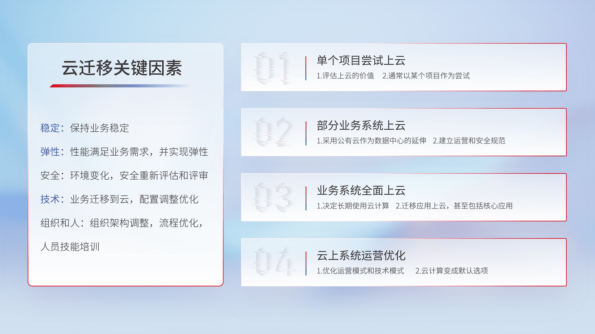 结合实际业务,,,从规划设计、、云平台选型、、、、云原生改造、、、数据迁移、、、、集成交付,,,迁移全过程为客户识别最佳上云路径,,,,做好风险识别管理,,设计网络架构、、、身份权限、、、安全审计合规、、操作审计、、、、日志审计、、、监控告警策略、、多站点容灾设计等,,,对云上基础设施进行整体规划,,,,提升IT治理水平,,,以满足弹性、、、、高可用、、、高性能的需求。。